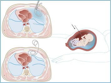 Figura: Posizionamento dello shunt toraco-amniotico che serve a decomprimere grosse cisti polmonari che possono comprimere il cuore e i vasi toracici fetali.